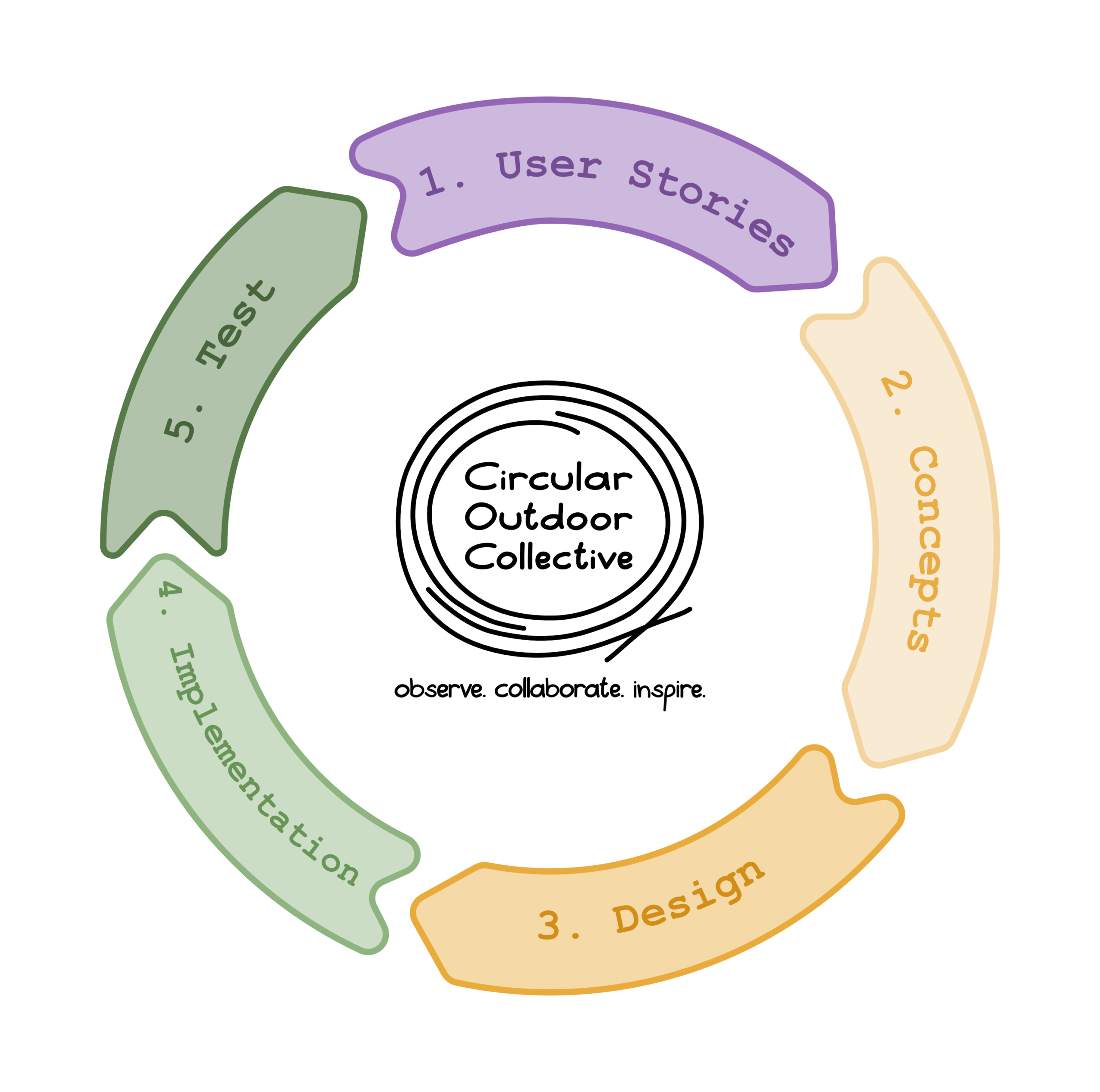 A good solution starts with properly identifying the problem and naming all requirements. This could be done by so called User Stories: A collection of individual points of view of the ones using, interacting with or being affected by the changes we are considering. However, we take this approach a bit further and ask ourselves which non-individuals may be affected. This could be the ecosystem, social structures of the nearby community, as well as future generations. These stories may change or be extended with time and additional insight. Actually that’s the beauty of working and thinking in a circular way: there’s no beginning and no end, just iterations, allowing continuous improvement.